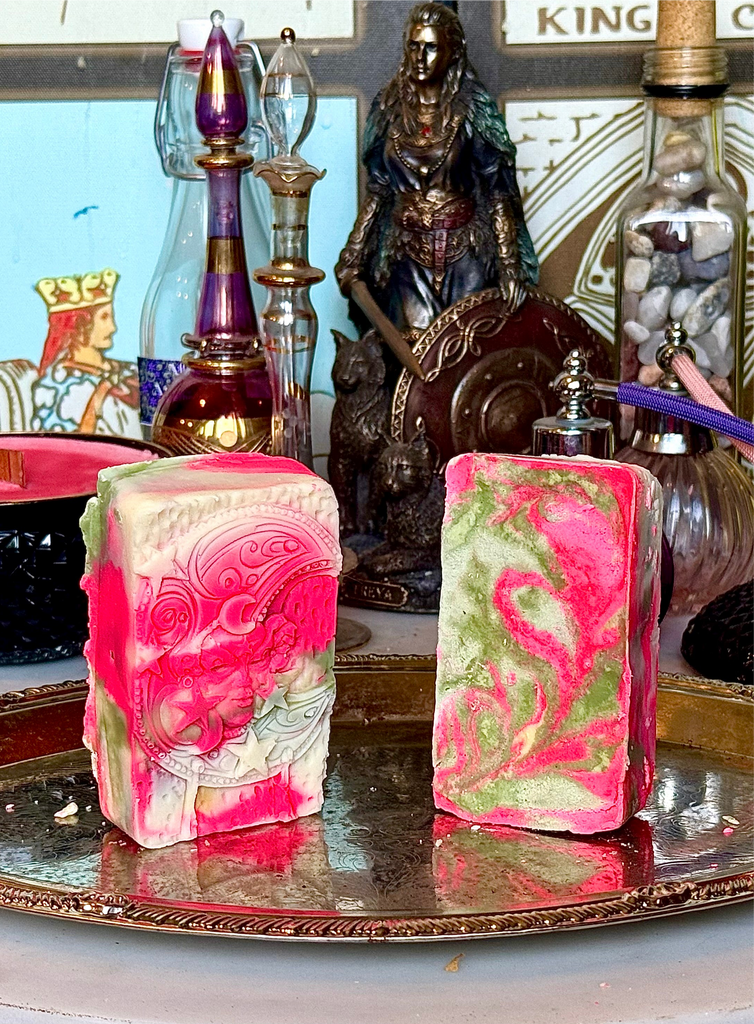 Introducing our Flower Moon Blend, Lunar soap conjuring, blended in a swirling recipe of Coconut, Castor, Sweet Almond, Olive, Palm, Canola, & Vitamin E, Oils, extracted sustainably, & stringently refined for purity, before being pigmented with only flower based colorants. Scented in a fragrant blend of Eucalyptus, Freesia, Chamomile, Mandarin, & Rose Oil rising like wildflower blooms tumbling on the wind, finishing with bottom notes of Amber, Palo Santo, Musk, & Patchouli, to ground your senses & leave your aura squeaky clean.