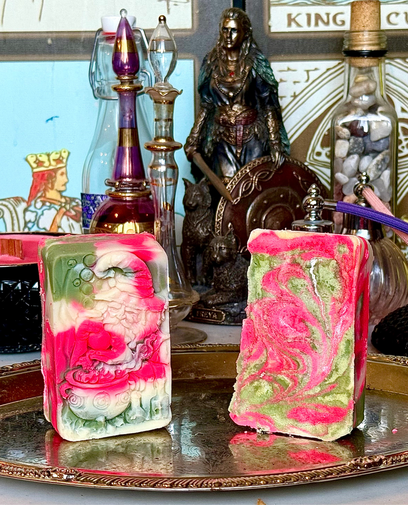 Introducing our Flower Moon Blend, Sorcerer soap conjuring, blended in a swirling recipe of Coconut, Castor, Sweet Almond, Olive, Palm, Canola, & Vitamin E, Oils, extracted sustainably, & stringently refined for purity, before being pigmented with only flower based colorants. Scented in a fragrant blend of Eucalyptus, Freesia, Chamomile, Mandarin, & Rose Oil rising like wildflower blooms tumbling on the wind, finishing with bottom notes of Amber, Palo Santo, Musk, & Patchouli, to ground your senses & leave your aura squeaky clean.