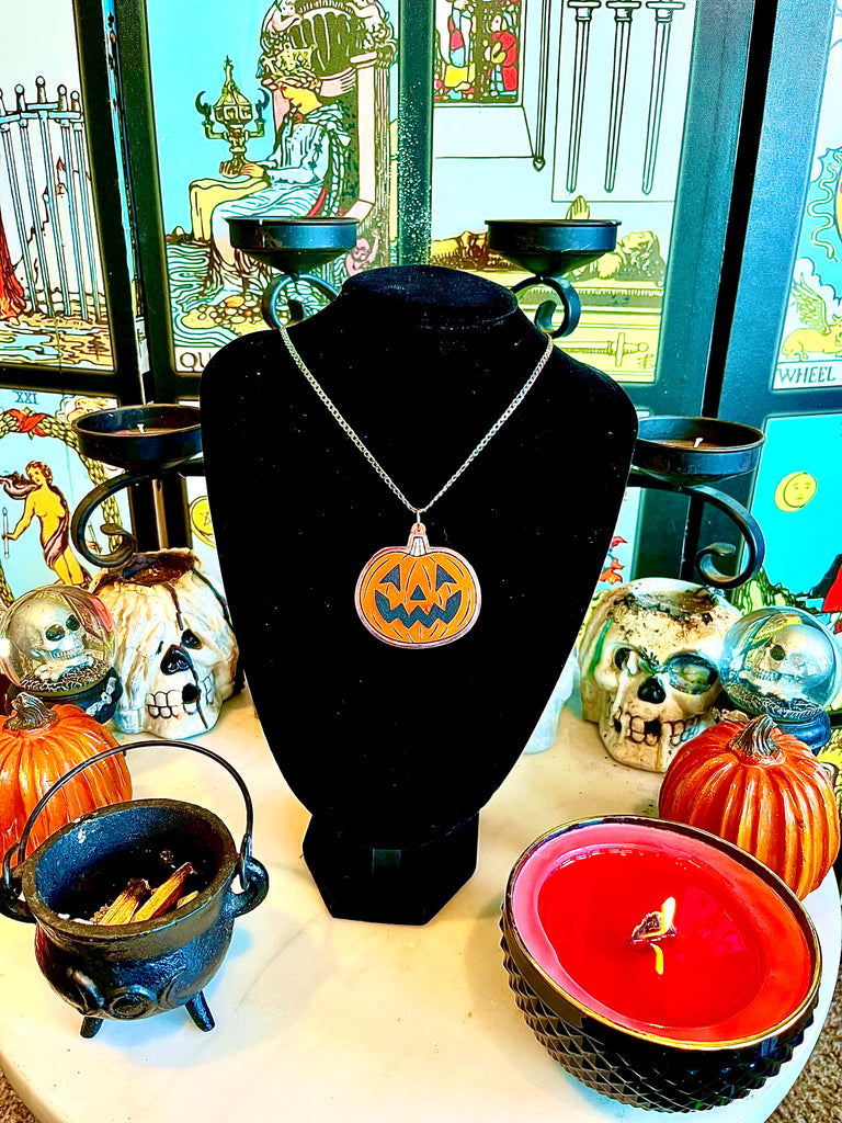 Carve out the details, to the perfect pumpkin themed outfit this Samhain with our 80s inspired Neon Halloween Jack o Lantern Necklace. Poured over the Autumn Equinox in Neon Orange eye black light activated eye candy pigments before being lined in the flattest black paint known to man developed by the wizards at culture hustle. Finally these pumpkins met their end, suspended on a 13 inch rainbow electroplated stainless steel necklace. These Spooktacular sentinels stand at the ready, to drive any evil spirits away from your dead man’s party gate.