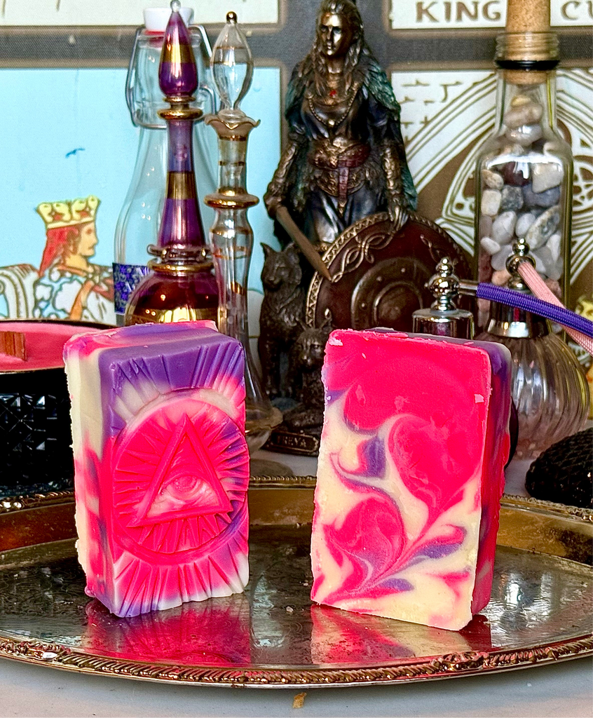 Introducing our Strawberry Blend, Eye of Horus Soap conjuring. Poured in a potent blend of Coconut, Castor, Sweet Almond, Olive, Palm, Canola, & Vitamin E, Oils, extracted sustainably, & stringently refined for purity, before being pigmented with flower based colorants only. Our Strawberry Moon blend is fresh scented in an enchanting blend of bergamot, cucumber, lemon, jasmine & violet blossoms with bottom notes of tree sap, cashmere & musk.