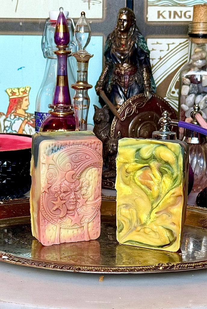 Introducing our Summerween Blend Lunar Soap conjuring. Poured in a potent blend of Coconut, Castor, Sweet Almond, Olive, Palm, Canola, & Vitamin E, Oils, extracted sustainably, & stringently refined for purity, before being pigmented with activated charcoal & flower based colorants only. Our Summerween Blend is fresh scented in an enchanting blend of jasmine, orchids, gardenias, ginger, black pepper, ylang ylang, & clove, ending in bottom notes of patchouli, vanilla, sandalwood, amber & musk, to awaken early fall months before its natural arrival across our earthly plane. Pouring these offerings also came with quite a soap science trick we rarely put on display, although poured in black, & white, & red all over, these soap offerings floral pigments have shifted to a bewitching blend of sunflower yellow, pumpkin orange, & vine green magickally.