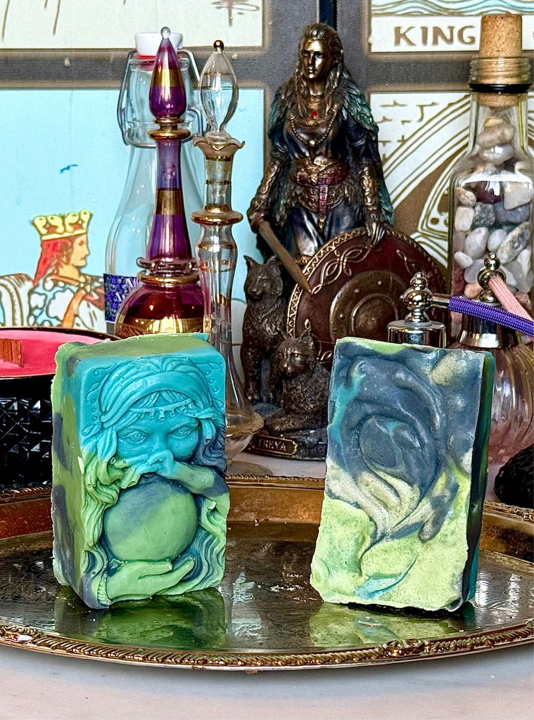 Introducing our Undercurrent Blend Fortune Teller Soap Conjuring. Witchcrafted in a swirling blend of Coconut, Castor, Sweet Almond, Olive, Palm, Canola, & Vitamin E, Oils, extracted sustainably, & stringently refined for purity, before being pigmented with activated charcoal & flower based colorants only. These deep sea blend conjurings are fresh scented with a cleansing mix of orange, bergamot, sparkling cassis, blue lilies, hyacinth, lemon zest, seaweed & patchouli, to evoke an oceanic atmosphere of cleansing purity.