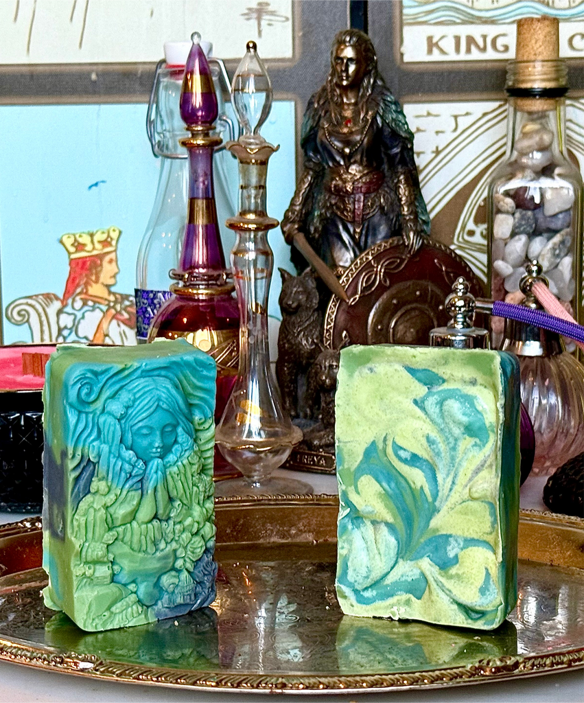 Introducing our Undercurrent Blend Priestess Soap Conjuring. Witchcrafted in a swirling blend of Coconut, Castor, Sweet Almond, Olive, Palm, Canola, & Vitamin E, Oils, extracted sustainably, & stringently refined for purity, before being pigmented with activated charcoal & flower based colorants only. These deep sea blend conjurings are fresh scented with a cleansing mix of orange, bergamot, sparkling cassis, blue lilies, hyacinth, lemon zest, seaweed & patchouli, to evoke an oceanic atmosphere of cleansing purity.