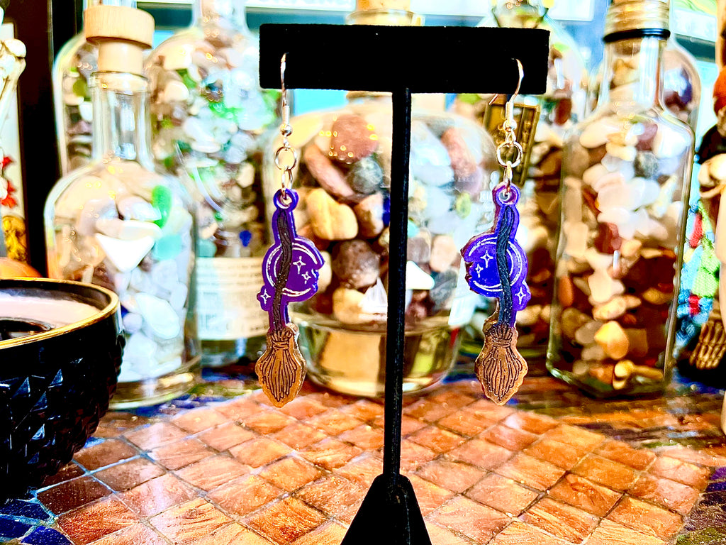 Touch the sky, kiss the clouds, & embrace your inner cauldron stirring, broom riding inner witch this Samhain Season with our Vintage Inspired Flying Broom earrings. Illustrated with secret selections from our crypt of eye candy pigments,& backed in samurai black art resin, before being lined in art deco silver & abyss black 2.0 conjured up by the wizards at culture hustle paints, finally rising to new heights with sterling silver jewelry hardware. These little brooms stand to sweep onlookers off their feet with a sense of strange magick zooming across their eye line, as you rush by in a whirl across the skyline.