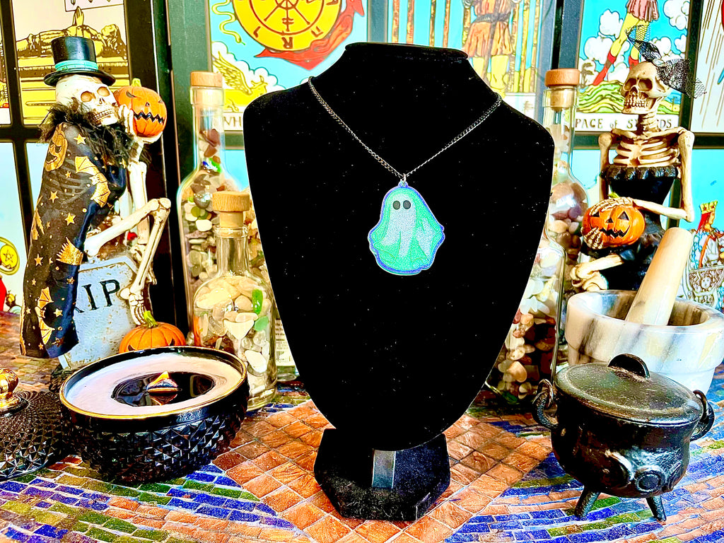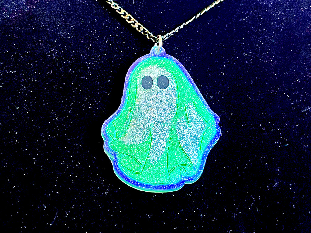 Rise from the grave in true spectral style & be the envy of spirits half your age in our Vintage Halloween Ghost Necklace. Poured over the course of the new moon, when spirit activity is at its peak, these fantastic phantoms are illustrated in eye candy ghostly white mica, & blended with a fine mist of imperial jade detailing before being lined in deco art metal flake paint. Their doom was sealed in art resin as clear as a cloudy apparition appearing from an unexpected place, finally these gorgeous ghosts met their end on a 13 inch electroplated black stainless steel chain, are you be brave enough to summon one to your party this Samhain?