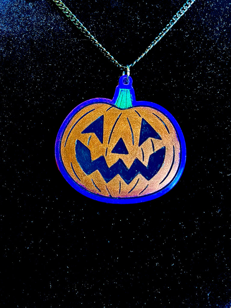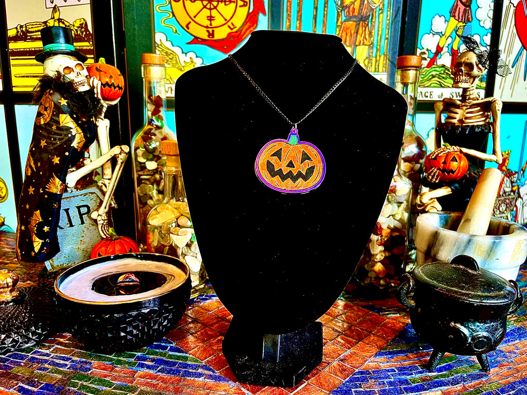 Carve out the details, to the perfect pumpkin themed outfit this Samhain with our Vintage inspired Jack o Lantern Necklace. Illustrated in a copper sunburst, of rainbow orange eye candy mica, backed in samurai black art resin, before being lined in the flattest black paint known to man developed by the wizards at culture hustle. Finally these pumpkins met their end, suspended on a 13 inch black electroplated stainless steel necklace. These Spooktacular sentinels stand at the ready, to drive any evil spirits away from your dead man’s party gate.